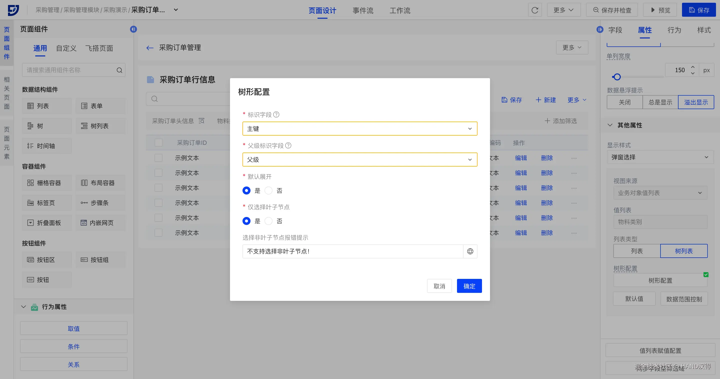 设置列表类型为树列表后,可以在属性面板进行树形配置,支持配置标识字段、父级标识字段用于构成树形结构,还可以配置树形值列表是否默认展开、仅选择叶子结点等属性。