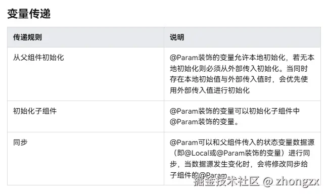 - 被@Param装饰的变量能够在初始化自定义组件时从外部传入,当数据源也是状态变量时,数据源的修改会同步给@Param。