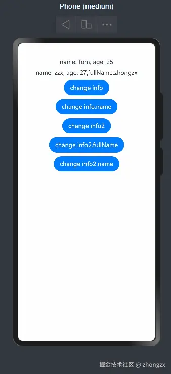 - 点击“change info1&info2”按钮,Text1不会刷新,Text2会刷新。