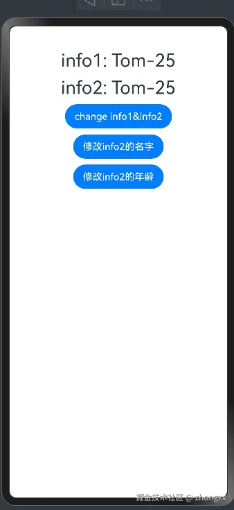 - 点击“修改info2的年龄” 按钮,Text2不会刷新。