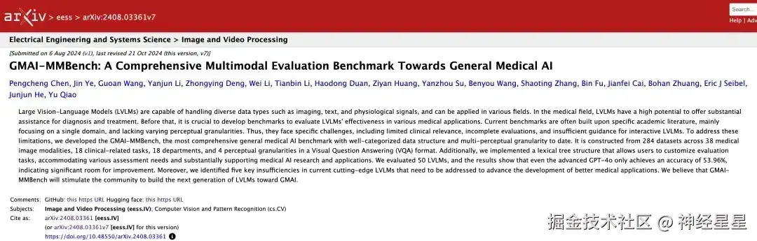 研究内容: 上海人工智能实验室联合华盛顿大学/莫纳什大学/华东师范大学等团队提出多模态医疗基准 GMAI-MMBench,包含来自全球的 284 个下游任务数据集,该数据集已在 HyperAI超神经官网上线!