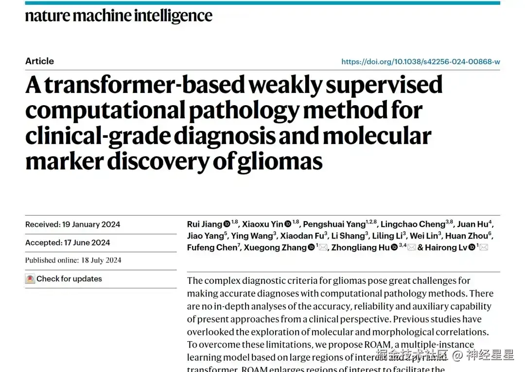 研究内容: 清华大学与中南大学湘雅医院合作,提出了一种基于大区域兴趣和金字塔 Transformer 的精准病理诊断 AI 基础模型 ROAM,用于胶质瘤的临床级诊断和分子标志物发现,并可拓展到其他类型肿瘤的病理诊断。