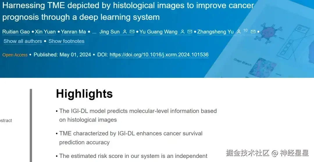 研究内容: 上海交通大学团队开发了深度学习系统 IGI-DL,通过组织病理学图像,为没有空间转录组数据的癌症患者预测肿瘤微环境信息,从而实现精确的癌症预后。