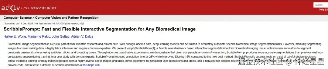 研究内容: 麻省理工学院计算机科学与人工智能实验室团队等,提出一种交互式生物医学图像分割通用模型 ScribblePrompt,支持不同注释方式灵活地进行分割任务,甚至可用于未经训练的标签和图像类型。