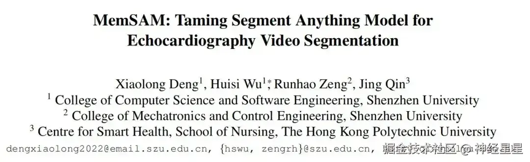 研究内容: 深圳大学和香港理工大学智能健康研究中心联合提出了一种新颖的超声心动图视频分割模型 MemSAM,将 SAM 应用于医学视频。