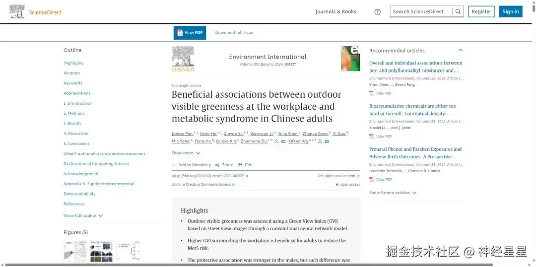 研究内容: 浙江大学团队通过卷积神经网络模型,基于街景图像的绿色视图指数对可见绿色暴露进行评估,并证实了工作场所周围较高的绿色景观指数有利于成年人降低代谢综合征风险。