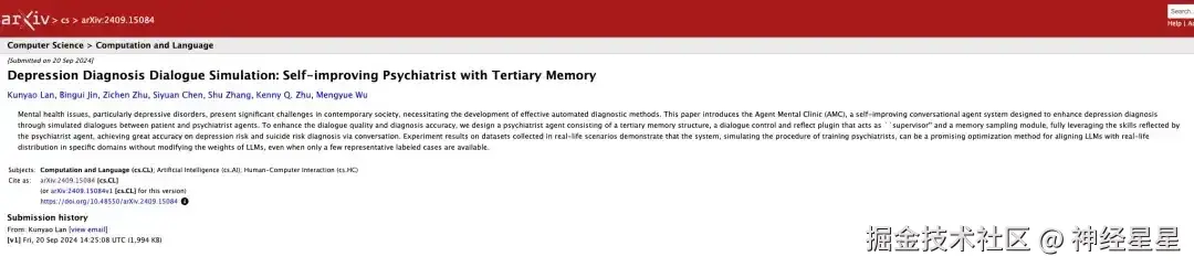 研究内容: 上海交通大学 X-LANCE 实验室团队等搭建了一种自动化大模型对话 Agent 模拟系统——智能体心理诊所 AMC (Agent Mental Clinic),用于抑郁症的初步诊断。