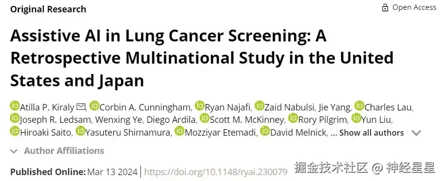研究内容: 谷歌 AI 团队开发并优化了人工智能辅助肺癌筛查的工作流程,在美国和日本进行了跨国性研究。