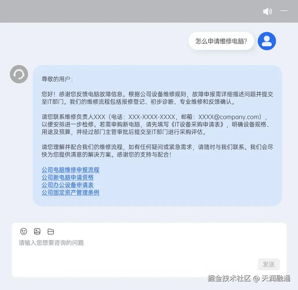 比如员工咨询电脑维修的情况,文本机器人会发送一长串文字,包含公司设备维修规则、维修流程、维修联系人、以及如何申购新电脑等等。其中虽然也包含了关键信息,但却需要员工从众多信息中寻找答案。