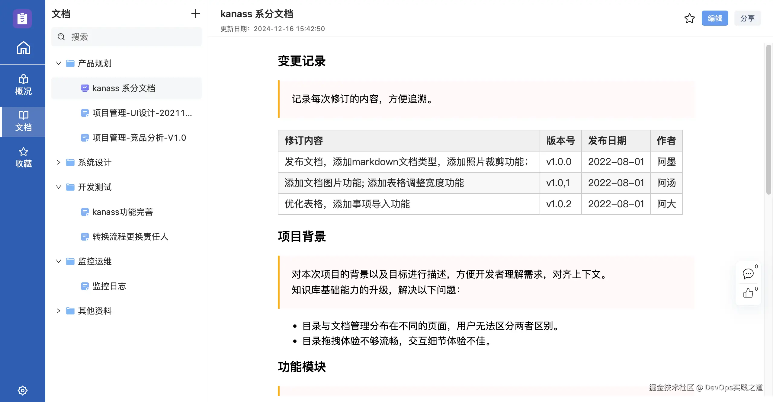 每个知识库可以看做一个独立的项目或团队工作区,里面有目录和文档,方便查找和管理。知识库可以根据项目、团队或部门进行划分,方便管理和查找。