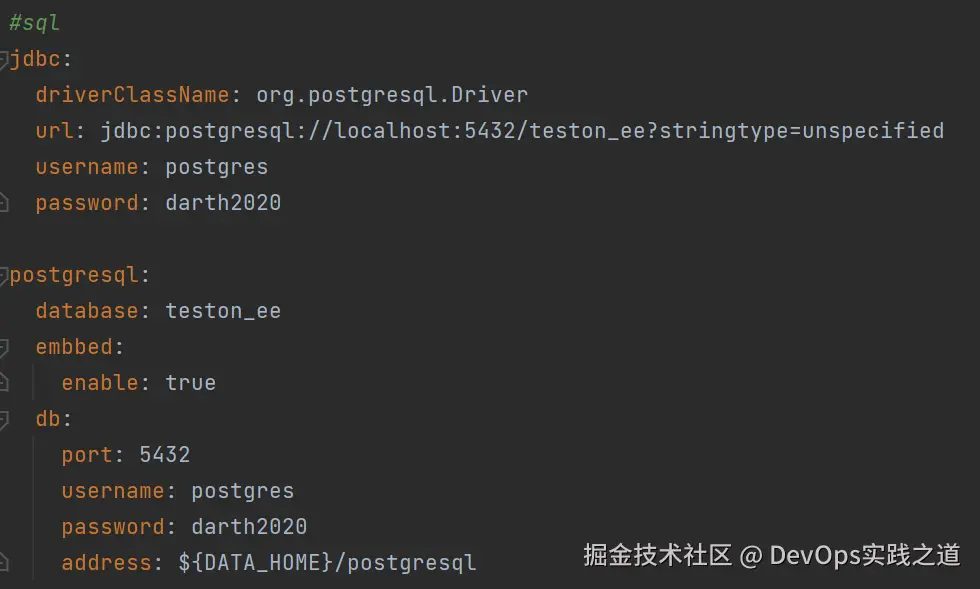 | postgresql.embbed.enable | 是否使用内嵌数据库,true:使用 false:不使用。如果配置为false,需要把该文件中jdbc下的数据库连接信息更改为自己的数据库地址,用户名以及密码。 |