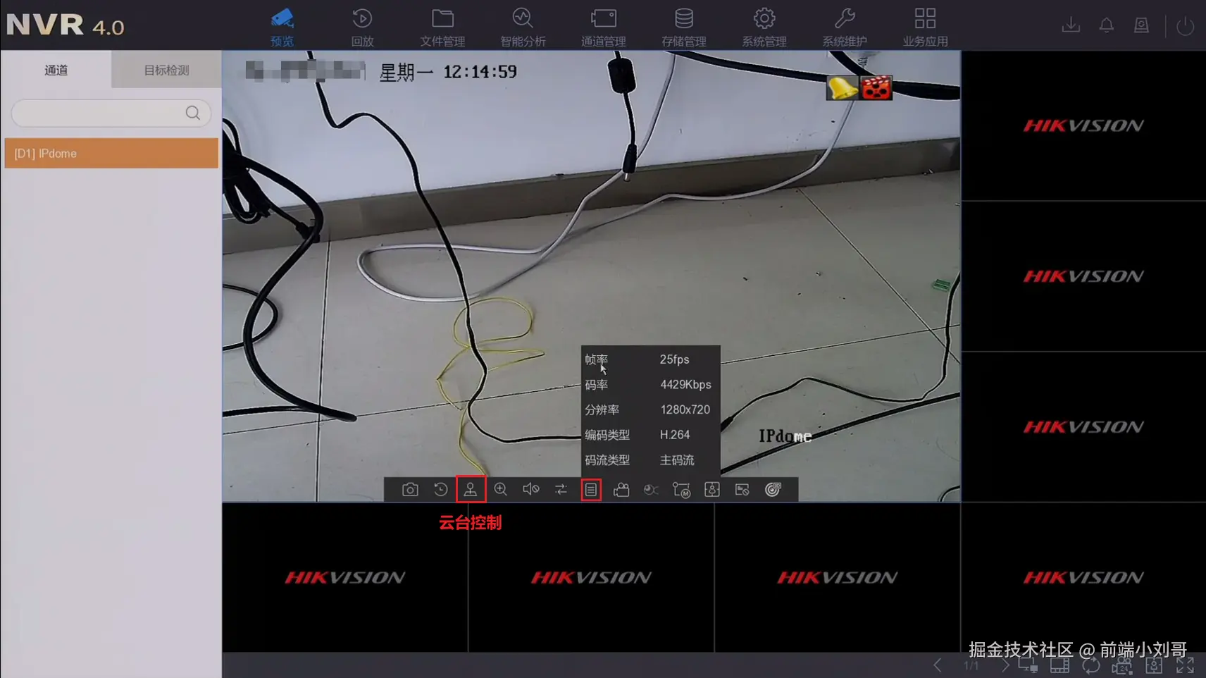 1、进入“预览”界面,选择对应的通道,鼠标左键调出菜单,选择“云台控制”图标。