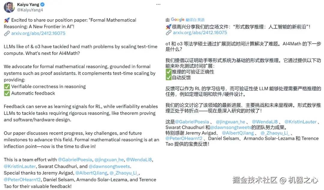 本文一作杨凯峪在 X 上表示,AI4Math 的下一步是使用证明助手等形式化系统来实现形式化数学推理。他也在推文以及论文中感谢了陶哲轩等数学家提供的反馈。