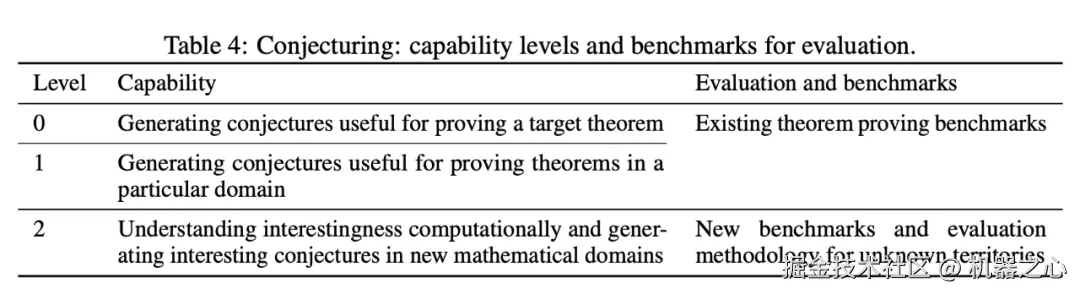 根据表 4 的分级标准,0 级水平是指 AI 能够针对特定问题或目标结果提出相关猜想。更进一步,在 1 级水平上,AI 就预计可以在给定研究领域内自主提出猜想,而不必局限于某个具体定理了。