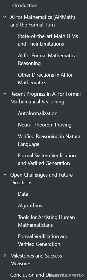 这篇论文的内容相当丰富,机器之心将在此介绍该论文的主要内容结构,尤其是该团队对多个相关研究方向的分级策略。这些分级可以帮助我们更好地界定 AI 在形式化数学推理方面的进展。下图为该综述的目录截图。
