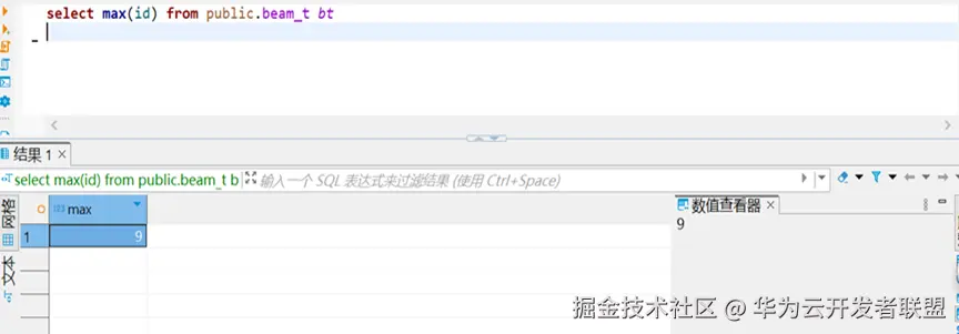 从GaussDB数据库中读取 beam_t 表中字段id的最大值,并记录为max1