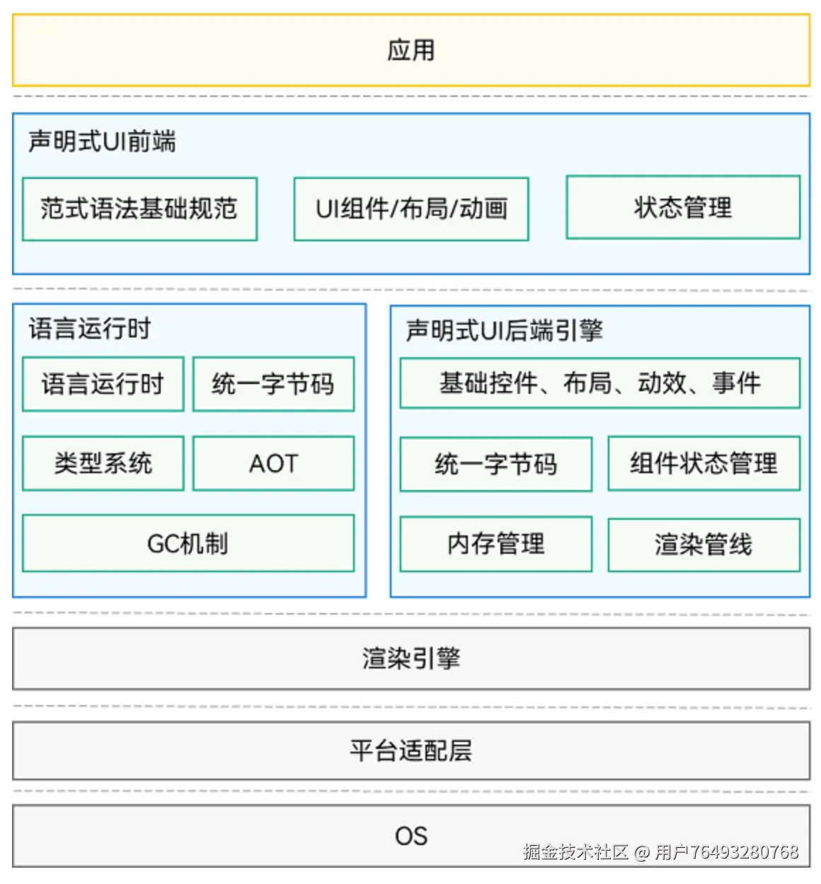 声明式UI前端和UI后端分层:UI后端采用C++语言构建,提供对应前端的基础组件、布局、动效、交互事件、组件状态管理和渲染管线。