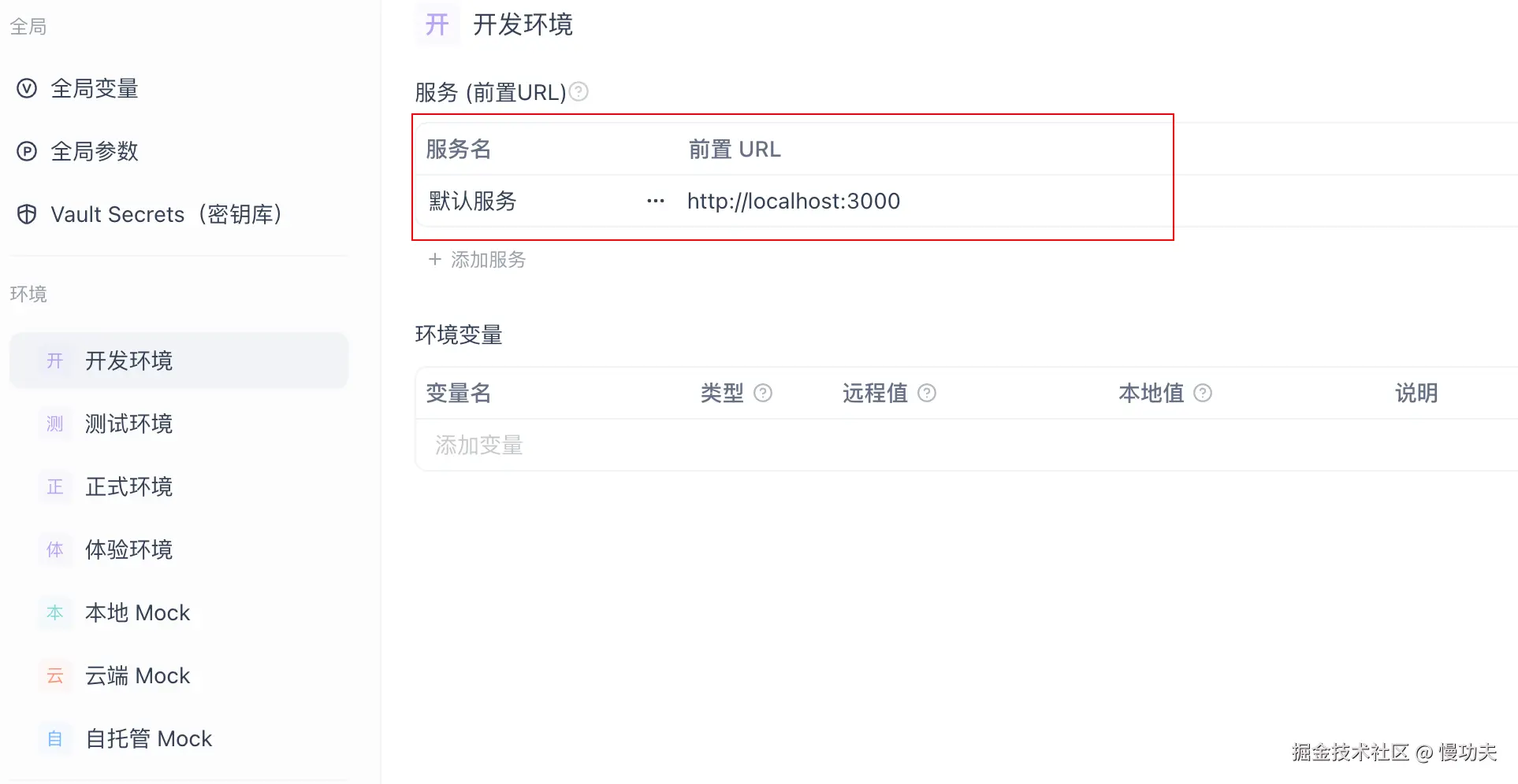 如果我们想更换请求的域名和端口号,我们可以直接在输入框里修改,也可以更换右上角的环境(目前是开发环境)