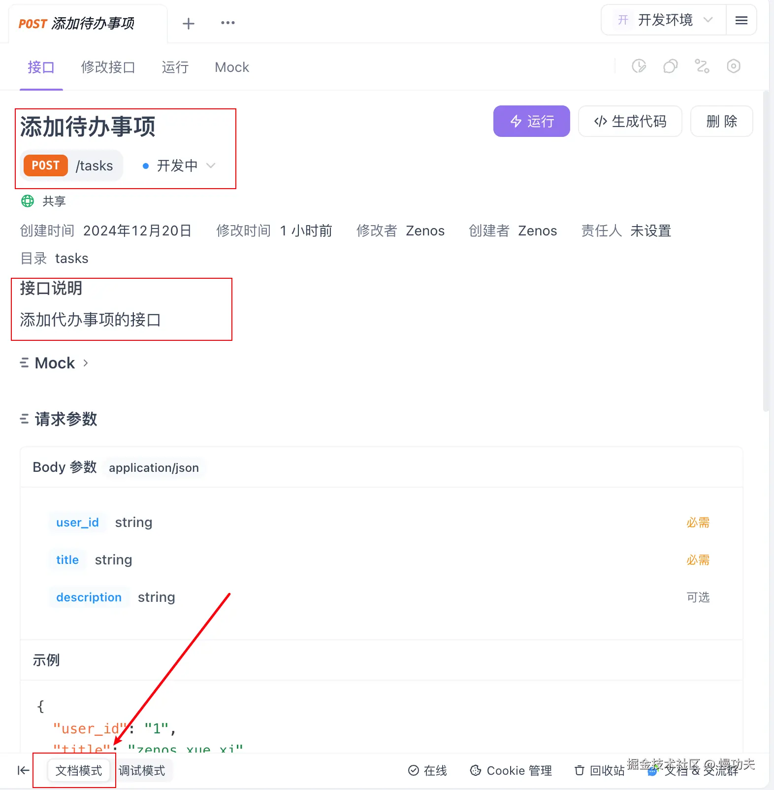 上面介绍了在 Apifox 中,查看接口的介绍,获取调用接口必要的信息。其实 Apifox 的功能,不仅于此。除了有接口文档的作用,还有调试接口的作用。