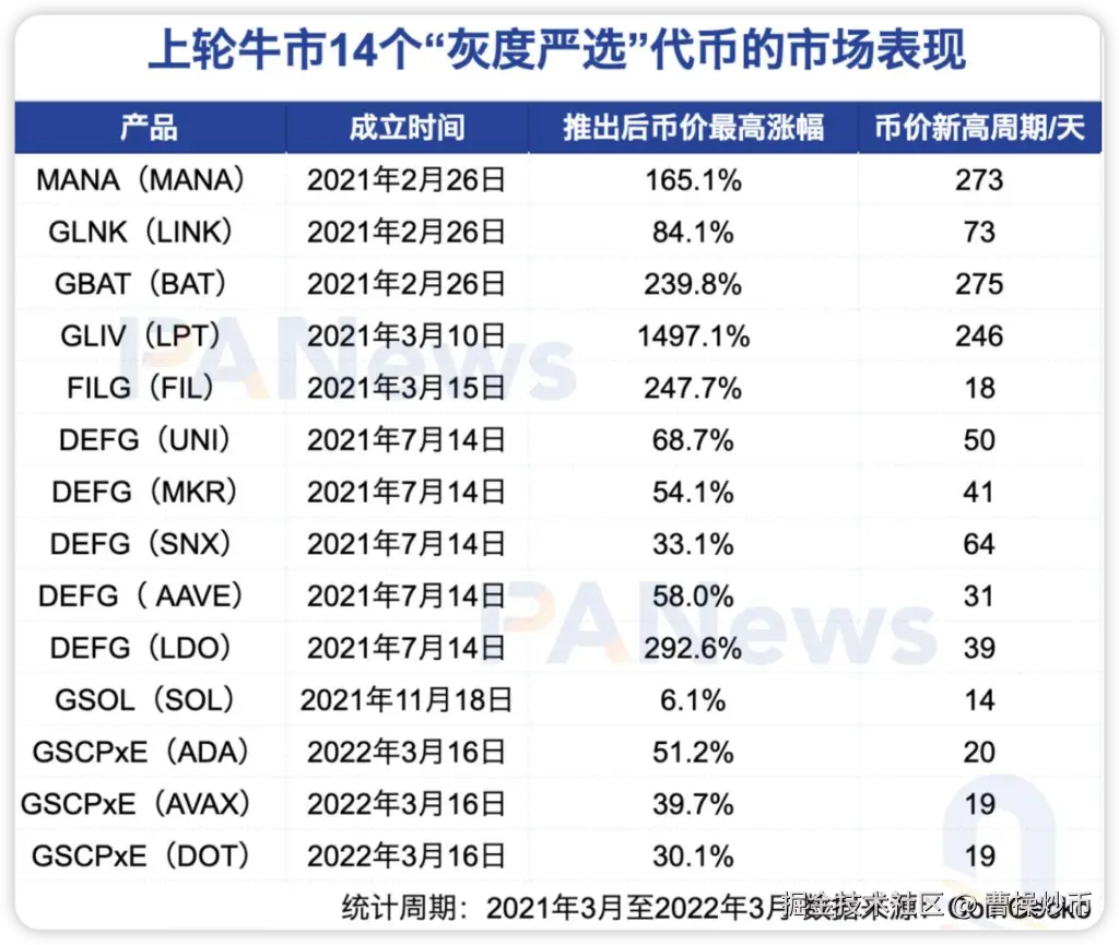 近一段时间以来,随着SUI和ZEN等币价飙升,“灰度效应”再现,灰度持仓也成为市场投资风向标之一。那么,灰度严选的加密代币在投资回报率方面的表现如何?本文PANews回顾了上轮牛市周期,灰度推出的加密信托基金所涉及的14个代币市场表现,时间周期为2021年3月至2022年3月。