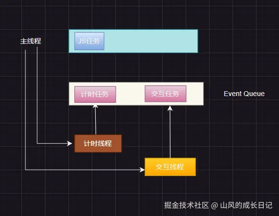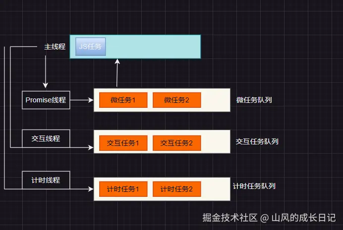 由于浏览器的渲染进程的渲染主线程只有一个, 它通过异步的方式避免阻塞, 而异步的具体实现方式就是通过事件循环。事件循环是指浏览器不断的从事件队列中读取任务并执行的过程, 主线程从全局JS任务开始执行, 遇到异步代码交给其它线程去处理, 比如网络线程、定时器线程等,再这些线程处理完之后会把回调事件包装成任务放入事件队列中, 主线从事件队列中读取任务并执行。任务本身没有优先级,他符合队列的特性总是先进先出,任务的优先级由它所在的任务队列决定。每个浏览器都必须有微任务队列, 还微任务和宏任务队列,但是随着浏览器的更加复杂,宏任务和微任务队列已经不再能满足,取而代之的是更加精细化的任务队列, 例如在chorme浏览器中有: 微任务队列、交互任务队列、计时器任务队列。同一类任务只能出现在同一个任务队列中, 不同类的任务可以出现在不同的任务队列中, 任务队列的优先级顺序是微任务队列、交互任务队列、计时器任务队列。