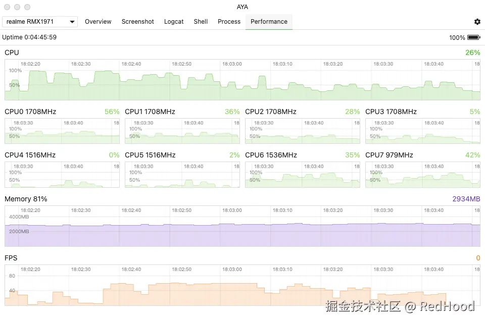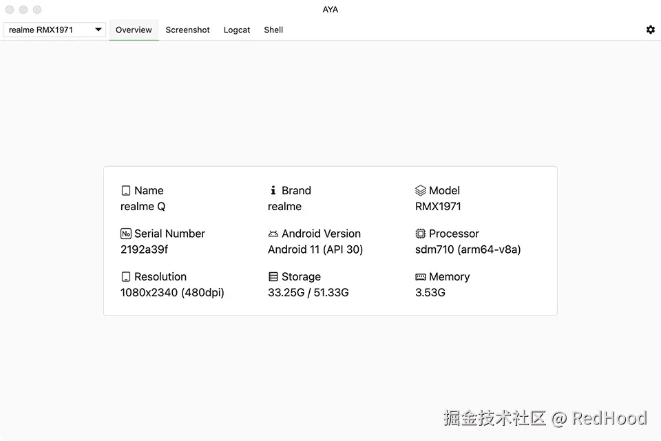 AYA 的主界面主要分为顶部的导航栏和剩余的面板展示区域。导航栏左侧是设备选择区域,可以切换当前连接的设备。中间是面板切换选项,包括概览、应用、截屏、日志、终端、进程、性能和网页共八个面板。
