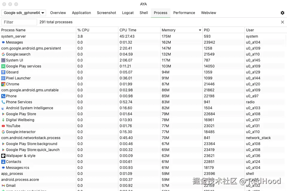 进程面板可以查看设备上所有进程的情况,本质上是 adb shell top 命令。