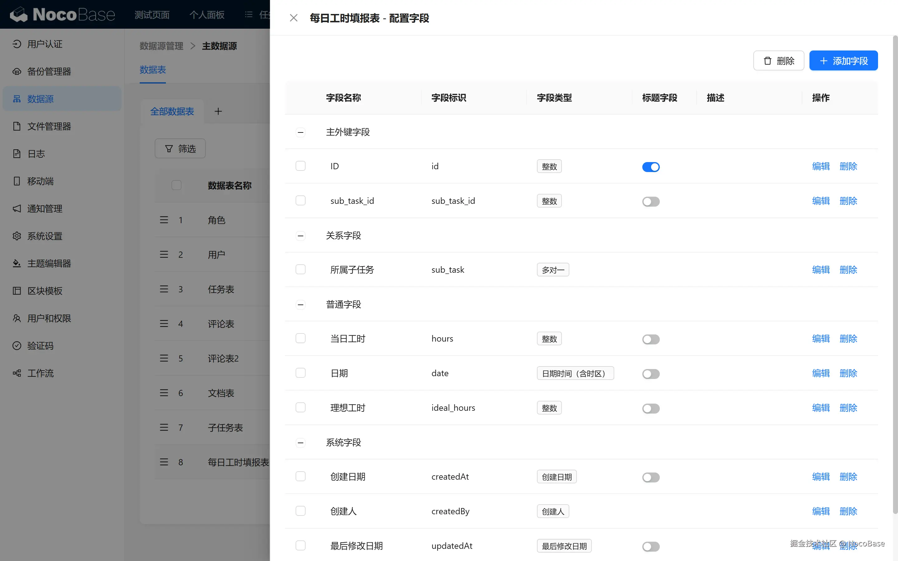 我们创建一个每日工时填报表,用于记录每日的任务完成情况。添加以下字段: