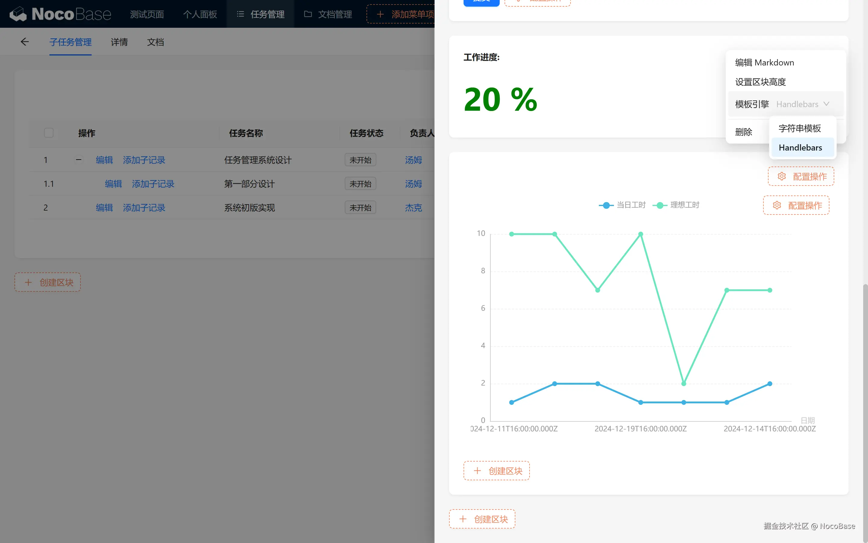 新建一个图表区块,用于统计 每日工时之和和 理想工时之和的变化,并根据日期维度显示任务进度。