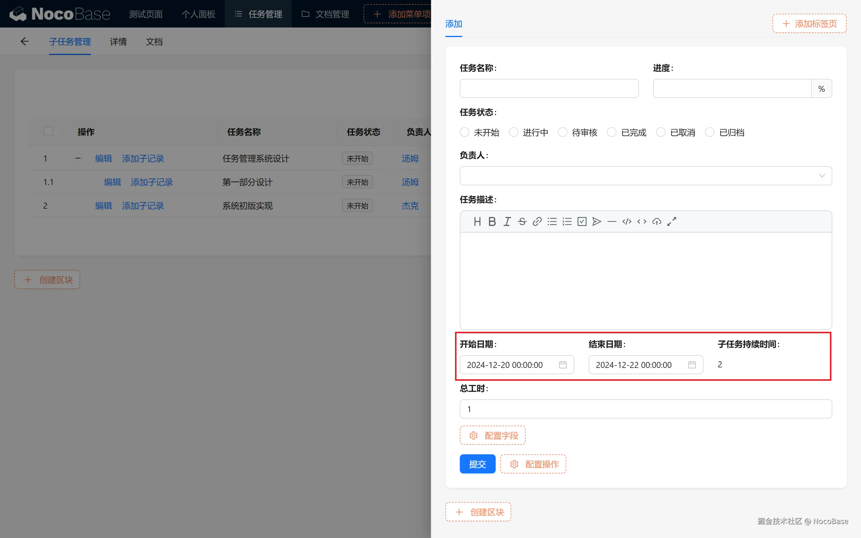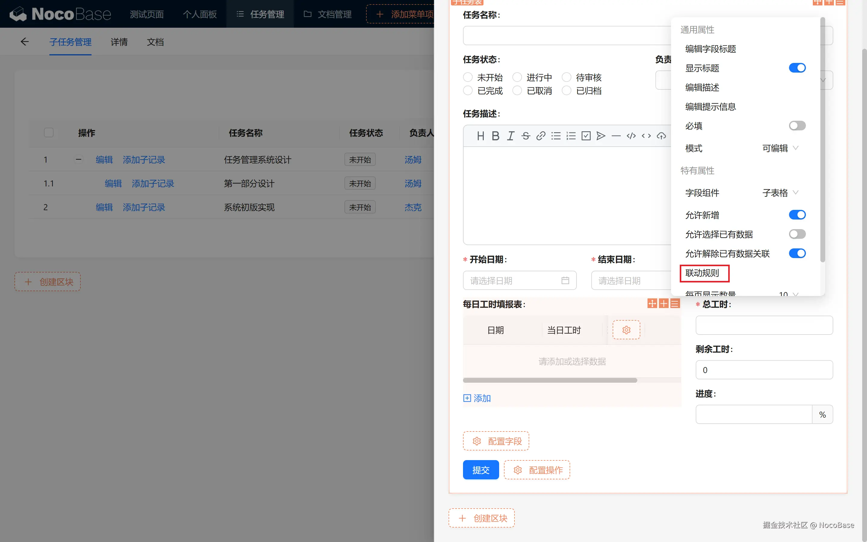 回到子任务编辑页面,将每日工时表设置为子表格形式展示,拖拽布局其他几个字段。这样可以方便地在子任务页面中填写和查看每日工时数据。