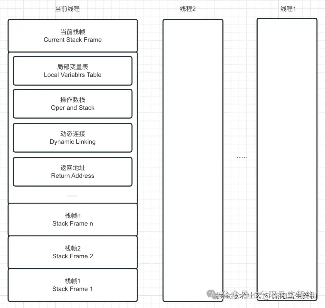 栈帧存储了方法的局部变量表、操作数栈、动态连接和返回地址等信息。每个方法从调用开始至调用结束,都对应一个栈帧从入栈到出栈的过程。