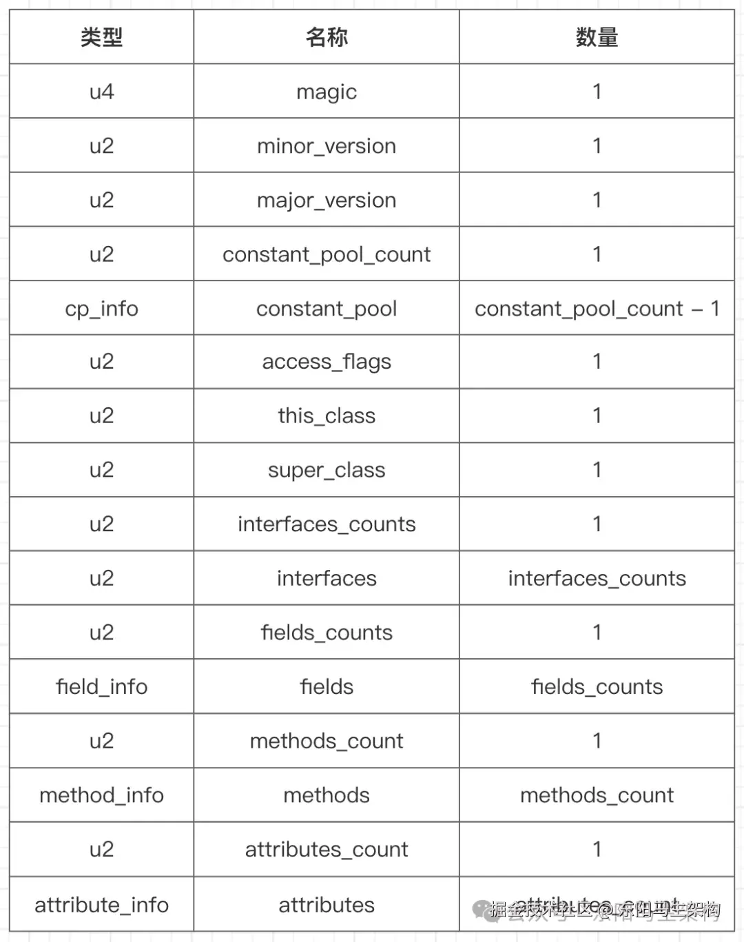 常量池中常量的数量是不固定的,所以在常量池的入口需放置一项u2类型的数据,代表常量池容量计数值。与Java中语言习惯不一样的是,这个容量计数是从1而不是0开始的。