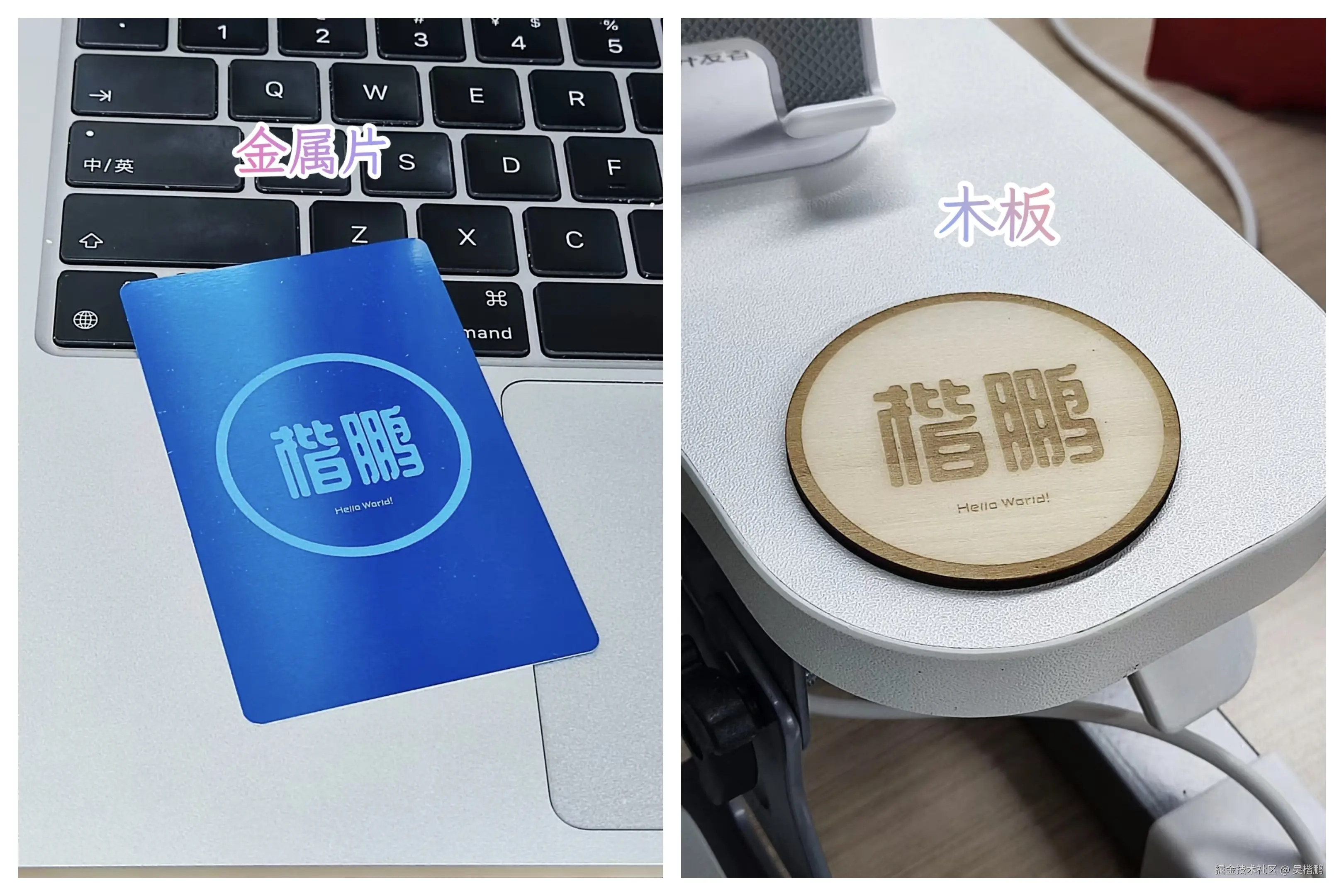 用 F1 Ultra 雕刻的金属卡片,用 P2S 切割+雕刻的木板: