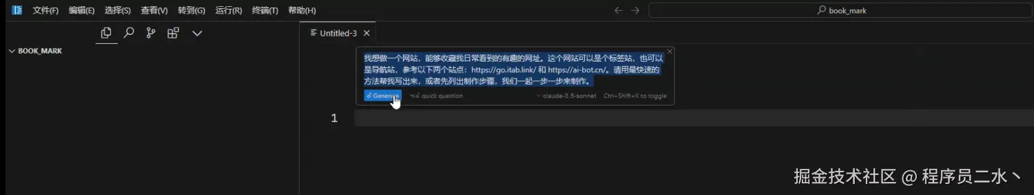 - Ctrl+N:新建文件 -》 Ctrl+K:打开AI编程框,输入需求