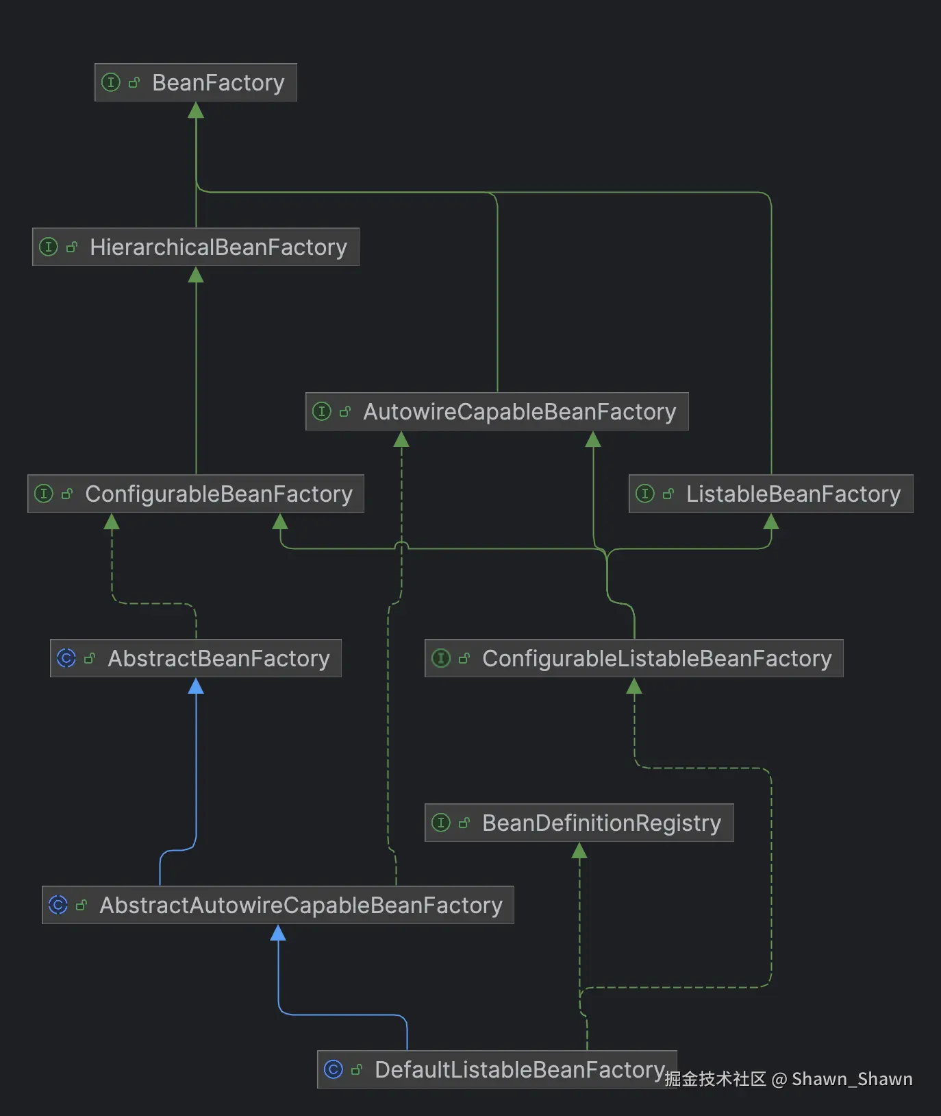 - ConfigurableListableBeanFactory扩展了ConfigurableBeanFactory,ListableBeanFactory, AutowireCapableBeanFactory三个基本接口。并扩展了注册内建依赖,获取BeanDefinition,冻结配置等方法。