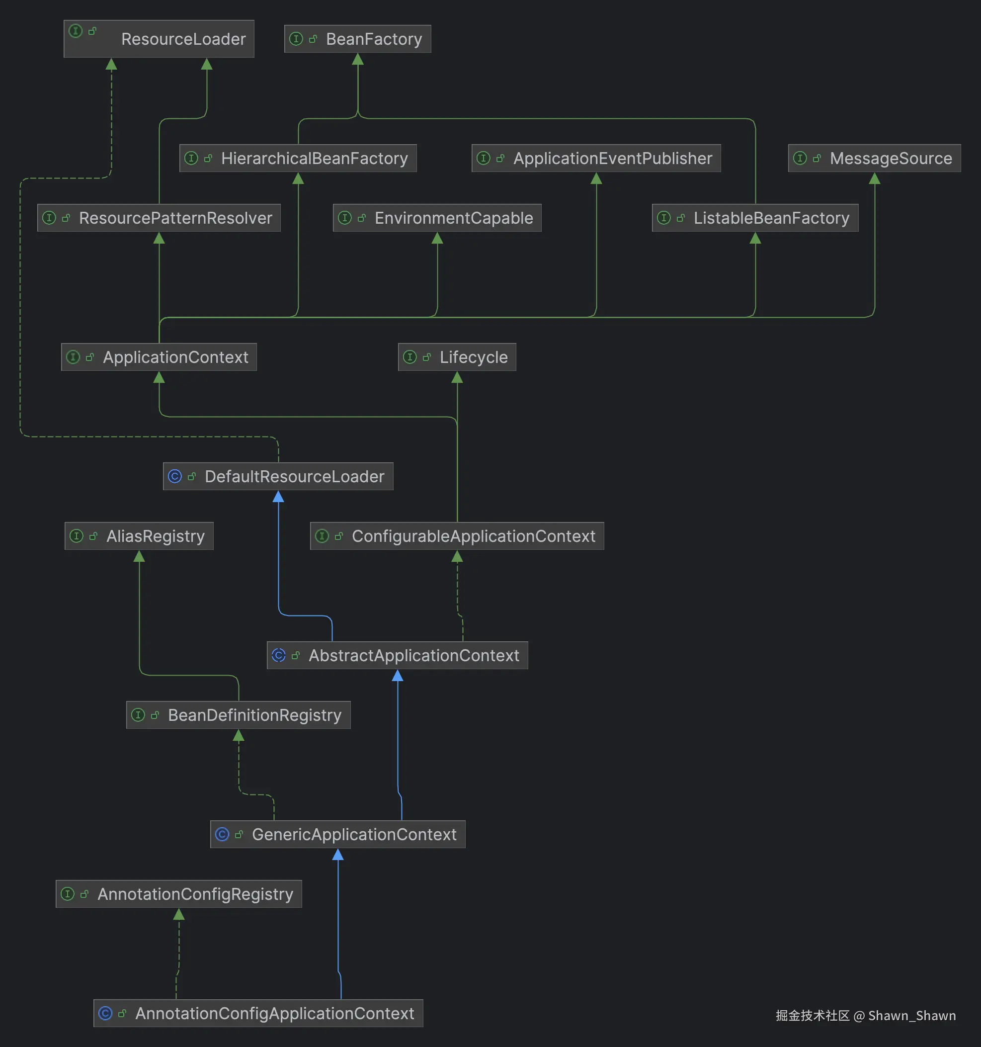 - ApplicationContext同时还继承了EnvironmentCapable,MessageSource,ResourcePatternResolver,所以ApplicationContext除了是Ioc容器外,也提供了Environment 抽象,国际化,资源管理相关能力。