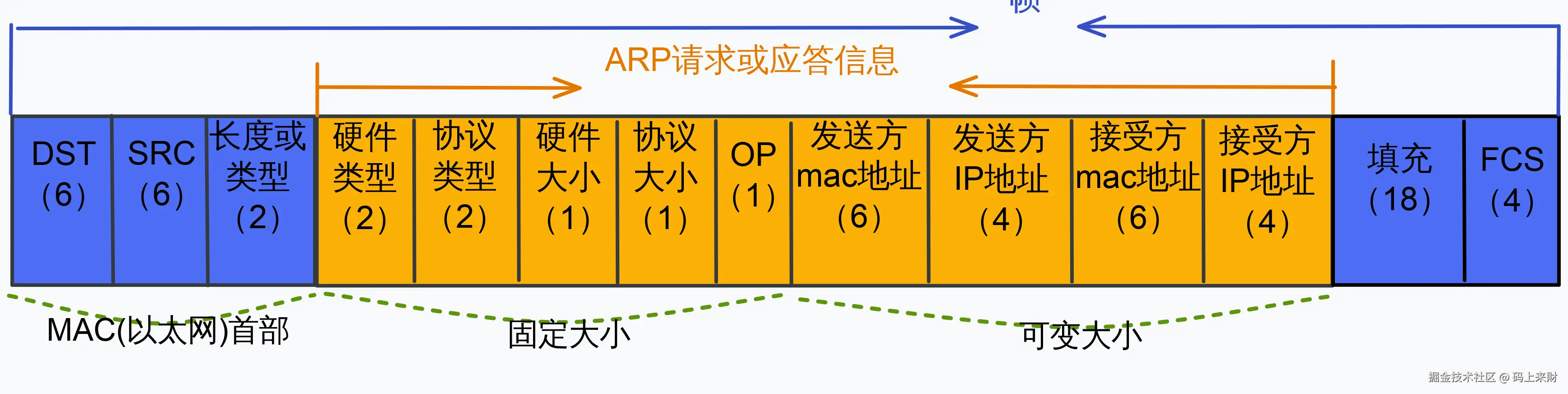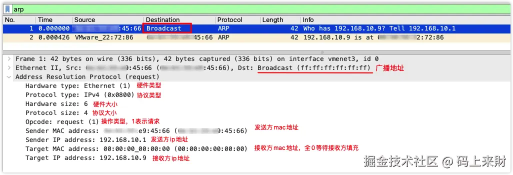 硬件类型:2字节,硬件地址类型,值为1时表示以太网协议类型:2字节,表示映射的协议地址类型,对于IP协议值为0x0800MAC地址长度:1字节,表示MAC地址长度,以字节为单位,此处为6IP协议地址长度:1字节,表示IP的长度,以字节为单位,此处为4操作类型:2字节,指定本次ARP报文类型。ARP请求(1)、ARP应答(2)、RARP请求(3)、RARP应答(4)源MAC地址:6字节,发送方的硬件地址源IP地址:4字节,发送方的IP地址目的MAC地址:6字节,接收方硬件地址,在请求报文中该字段值全为0,即00:00:00:00:00:00,表示任意地址,等待接收方来补充目的IP地址:4字节,接收方的IP地址
