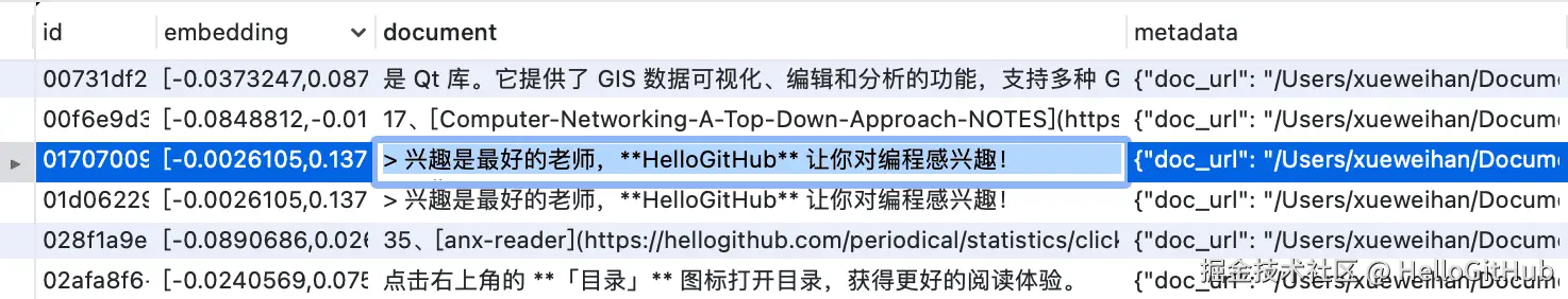 其中 embedding 列是一个类似数组形式的数据,这个就是通过 Embedding 模型将文档片段转化为向量数据的结果。这些向量数据能够捕捉文本的语义信息,使计算机能够更好地理解文本的含义,从而实现类似语义搜索的功能(计算距离),为后续问题与文档内容的匹配提供基础。