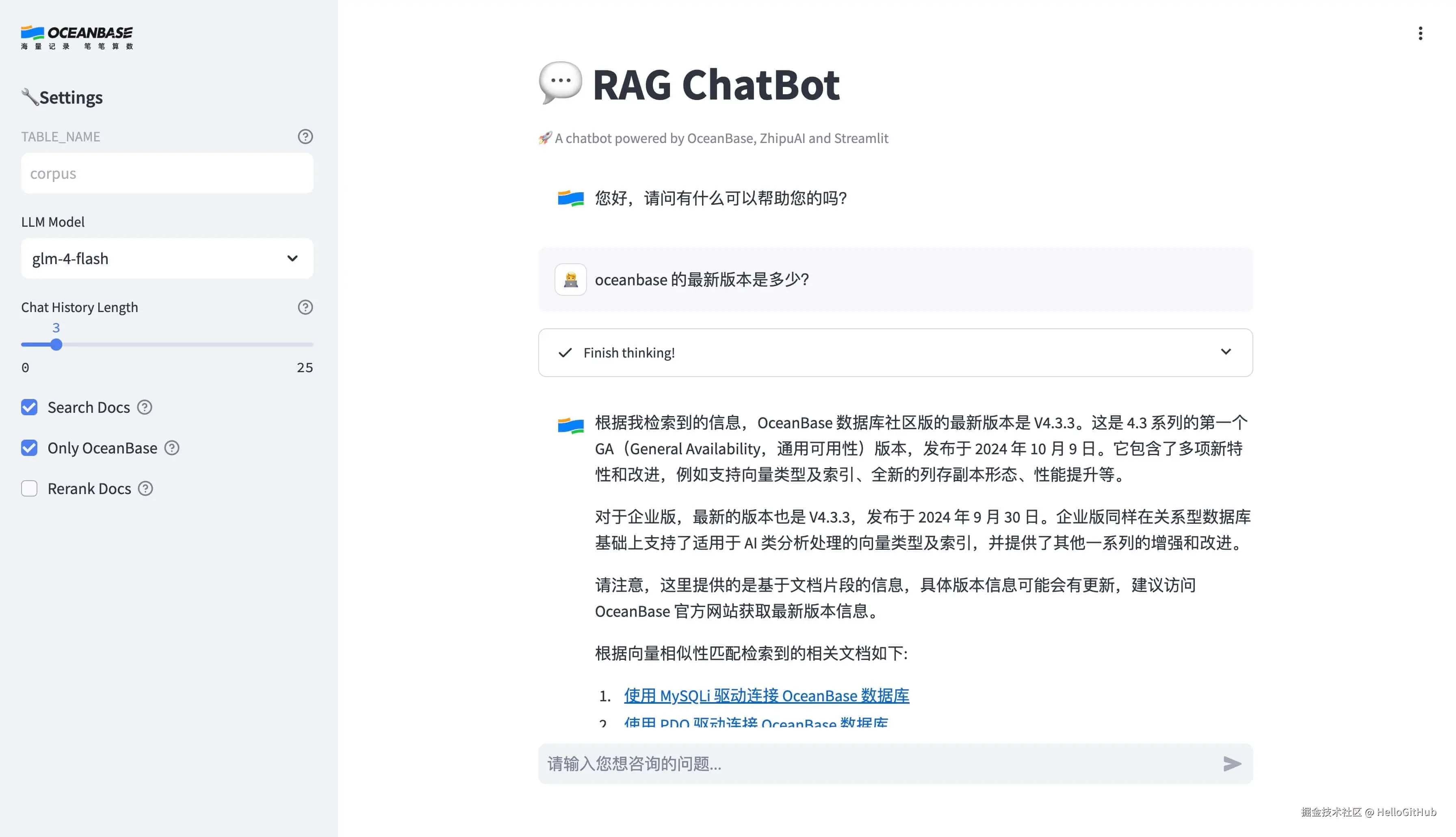 体验后,我感觉效果还不错,于是就萌生了一个想法:能不能把 OceanBase 的文档,换成 HelloGitHub 月刊的 Markdown 文件,灌进系统里,这样不就摇身一变,成为 HelloGitHub 专属的聊天机器人了吗? 说干就干!