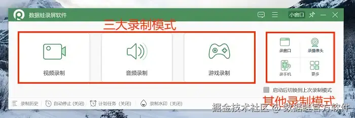 步骤1: 首先打开数据 蛙录屏软件,有多种录制模式可以进行选择,如视频录制、音频录制、游戏录制等。选择适合你需求的录制模式,本文以 “视频录制” 为例。