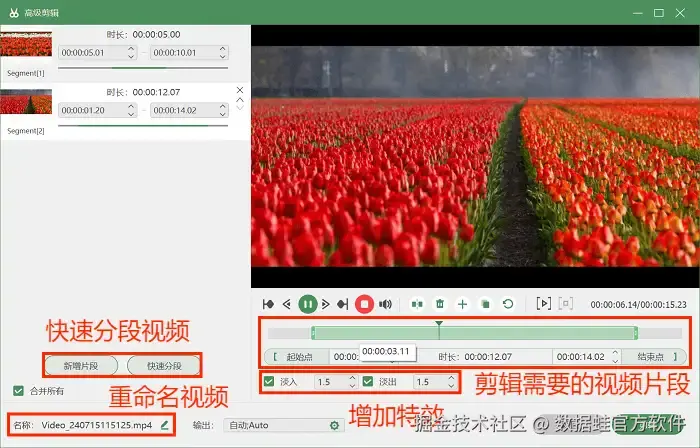 步骤3: 录制完成后,你可以使用该软件内置的视频编辑工具对视频进行剪辑、快速分段、增加特效、给视频重命名等操作。