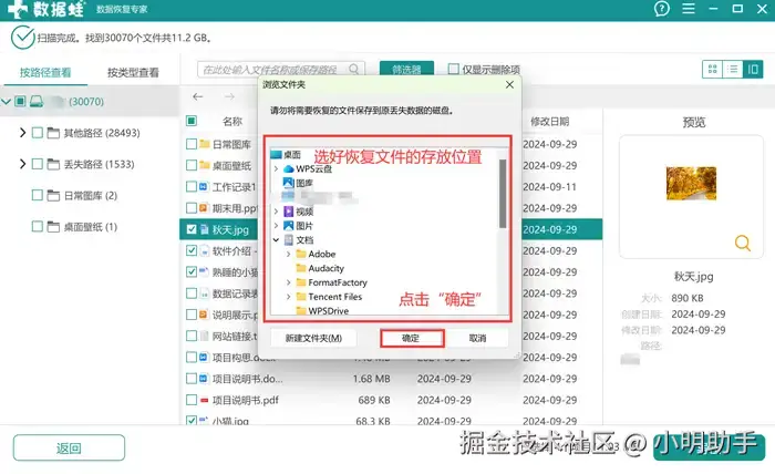 步骤3: 最后在“浏览文件夹”中选择恢复文件的存放位置。