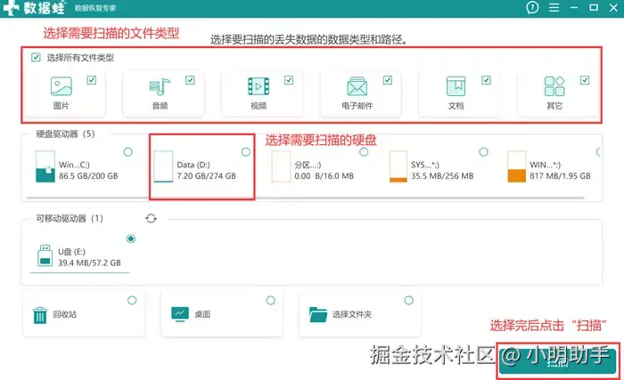 步骤1: 启动这款软件进入首页,然后选择好自己需要恢复的数据类型和需要扫描的硬盘,最后点击“扫描”;