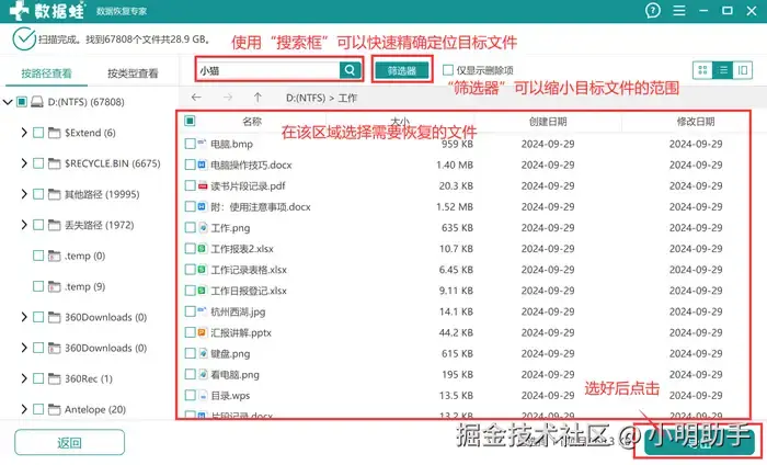 步骤2: 在扫描完毕后选择自己需要恢复的文件,可以借助“搜索框”、“筛选器”等工具帮助自己更快找到目标文件,选好后点击“导出”;