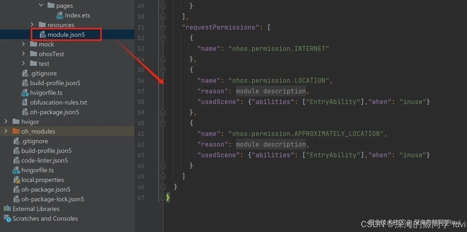 用户首次同意该权限,并且已开启系统定位,那么直接拉起系统权限的申请弹窗即可,需要注意的是使用 AtManager 授权权限的前提是需要在模块的 module.json5 中添加权限。