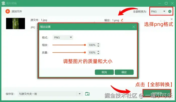 提示:如果需要调整图片的质量和大小,可以点击右上角的绿色小齿轮按钮进行统一的输出设置,也可以点击每张图片对应的右侧选择框单独调整图片设置。