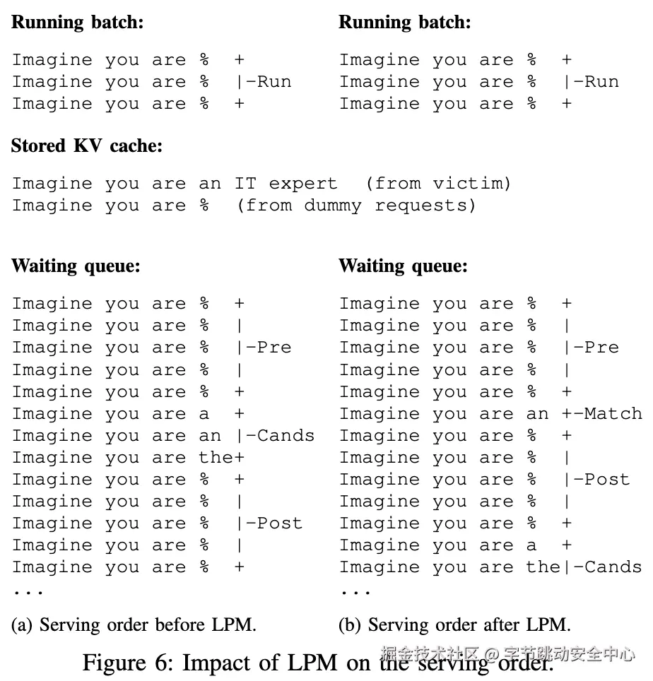 - 触发KV缓存共享: 对于成功触发KV缓存共享的场景,dummy请求的匹配长度依旧为4,此时成功匹配的匹配长度也为4,其他的未匹配的请求的匹配长度为3。所以此时的具体处理顺序为:第一个dummy batch,匹配到的请求,第二个dummy batch,和其余的candidates。这里第二个dummy batch可以帮助放大顺序改变带来的差异,从而能够令攻击者在端侧判断出顺序的改变。