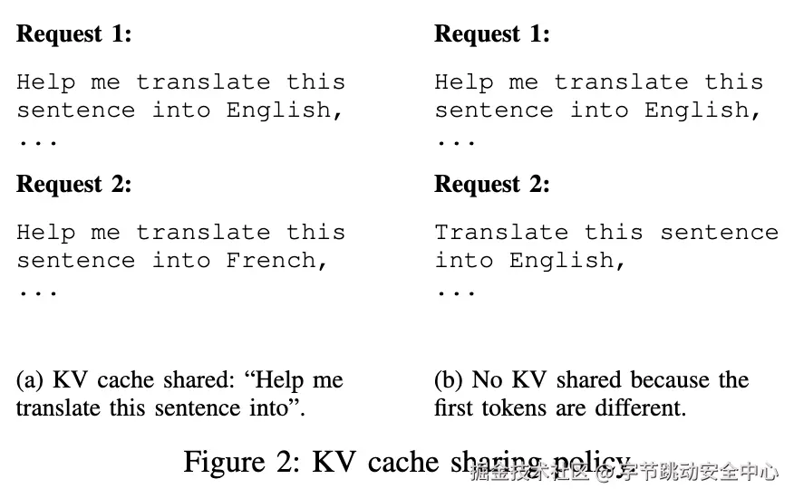 攻击核心:如果攻击者能够观察到自身请求是否触发了KV缓存共享,则可以判断其请求与已处理的请求是否相同或部分相同。攻击者通过每次增加一个 token 并反复请求,从而逐个token地还原出其他用户的请求内容。