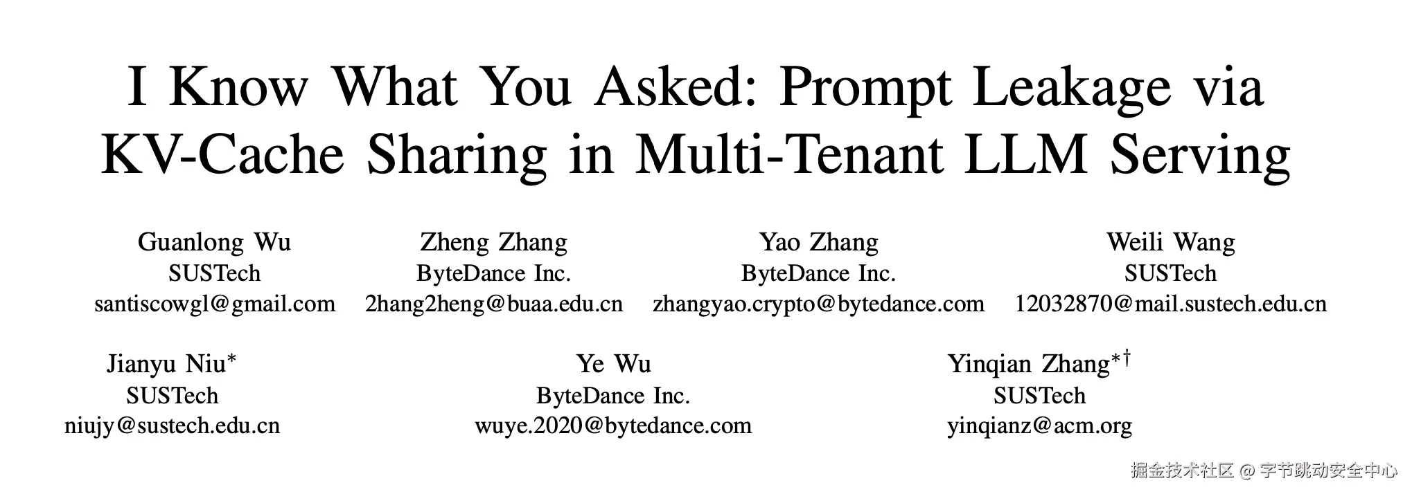 抖音集团安全研究团队和南方科技大学可信系统安全实验室合作的研究论文揭示了大语言模型安全领域服务框架的侧信道漏洞,利用多租户场景下的KV缓存共享机制精确恢复了用户提示词。本工作成果《I Know What You Asked: Prompt Leakage via KV-Cache Sharing in Multi-Tenant LLM Serving 》 已被安全领域顶级会议NDSS 2025接收。