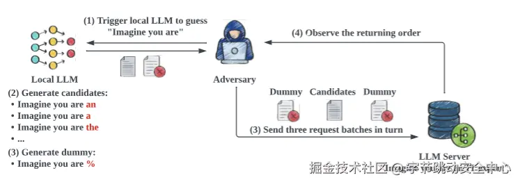 - 候选请求发送: 在生成本地候选之后, 攻击者会将三批请求依次发送,分别为由dummy token构成的dummy batch,候选token构成的候选batch,和另一批由dummy token构成的dummy batch。这样的设定是为了更容易观测到的侧信道信息。